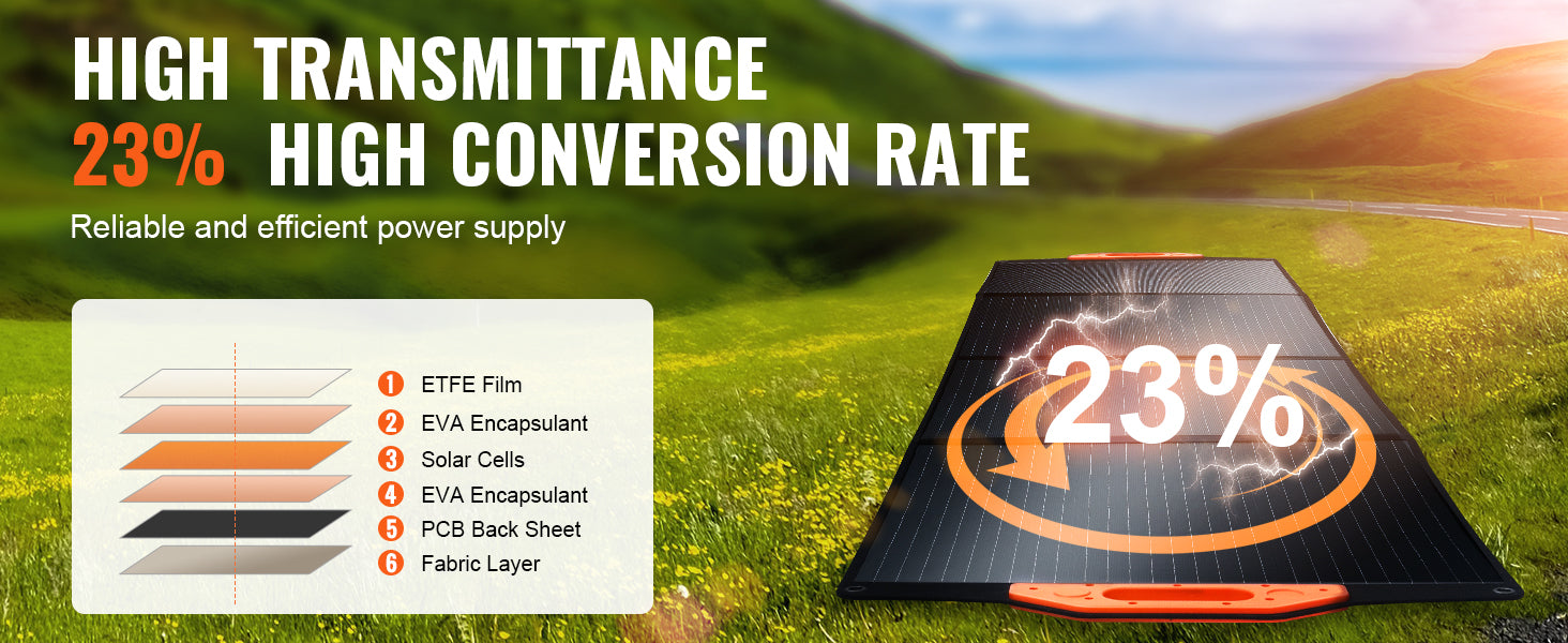 Foldable and Portable: Embrace the portability with our foldable monocrystalline ETFE solar charger. With 16.59 lbs light weight and compact folded size, it's your perfect companion for house, RV, camping, hiking, and fishing trips, bringing efficient power right where you need it.